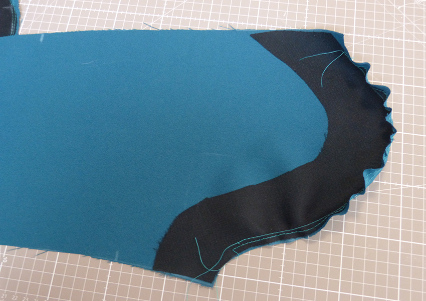 No se cose todo el cuello de una vez, primero se cose la capa de cuello entretelada a la parte del exterior de la chaqueta y después la parte del cuello sin entretela a la parte de forro.