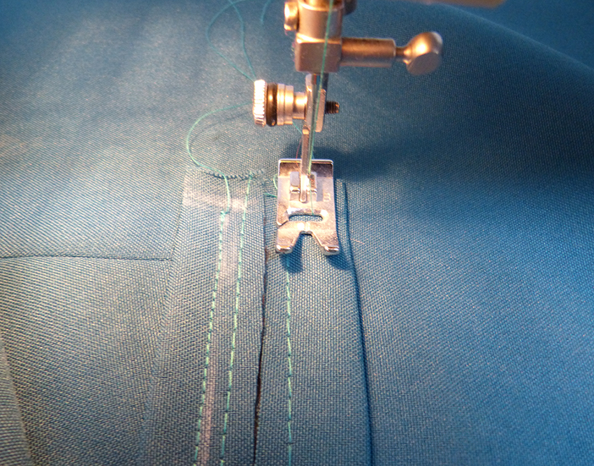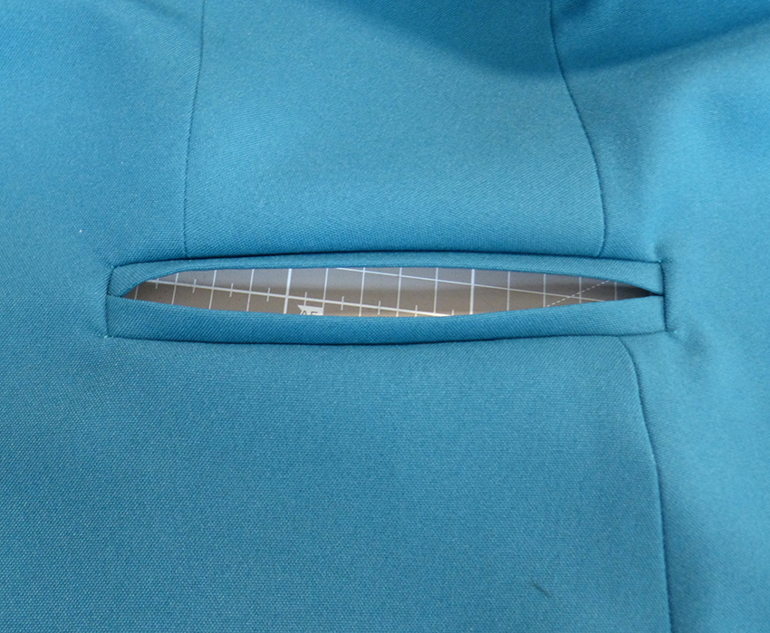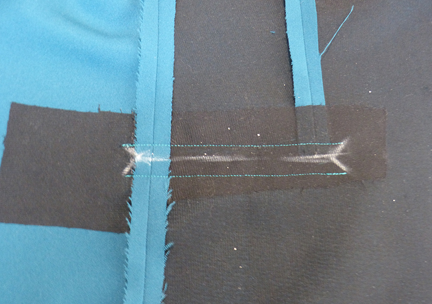 Coser con punto oblicuo, las mangas de forro al cuerpo, calando la puntada hasta la costura del exterior de la prenda.