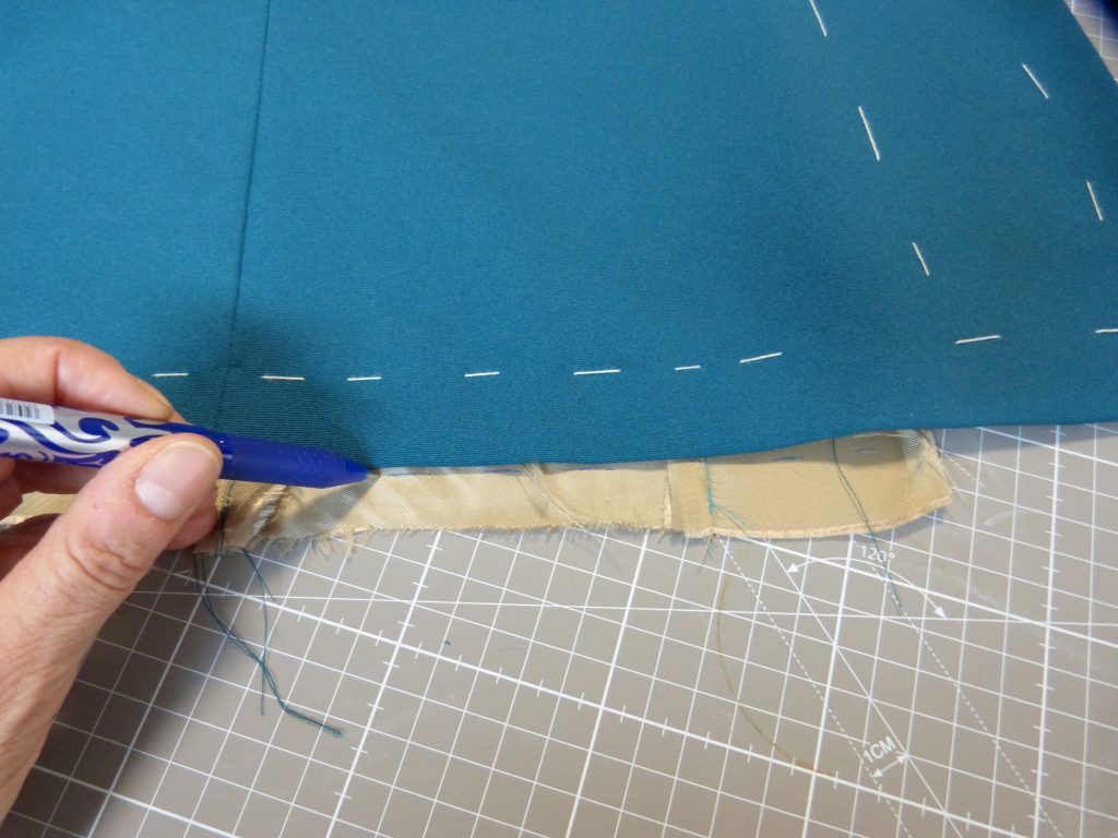 Colocar bien asentado el forro de la chaqueta con la chaqueta y dibujar con bolígrafo borrable, una línea en el forro de la chaqueta, coincidiendo con el de la chaqueta exterior, digamos que la chaqueta sirve de plantilla.
