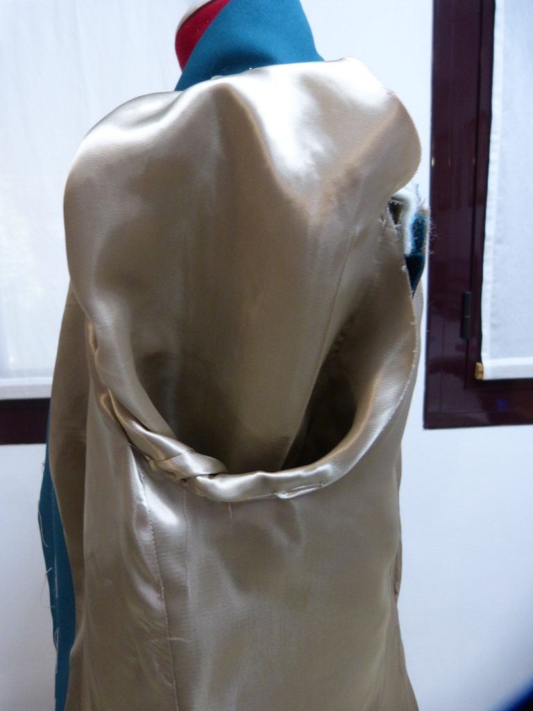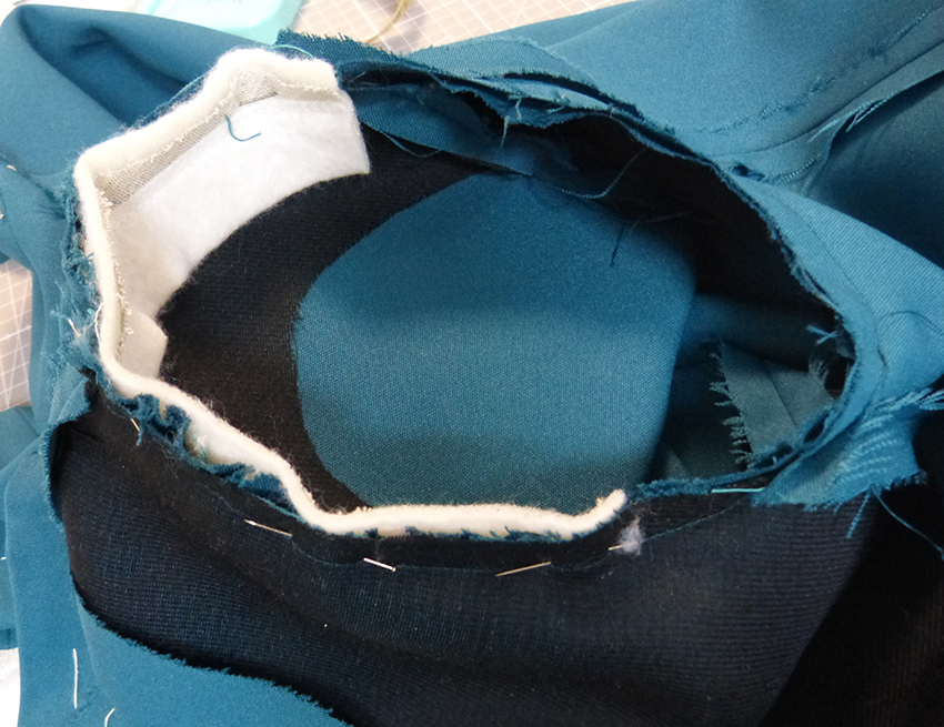Con la prenda del revés, sujetar la sisa del forro a la sisa de la chaqueta (todo por el interior) el forro quedará por encima de la hombrera.