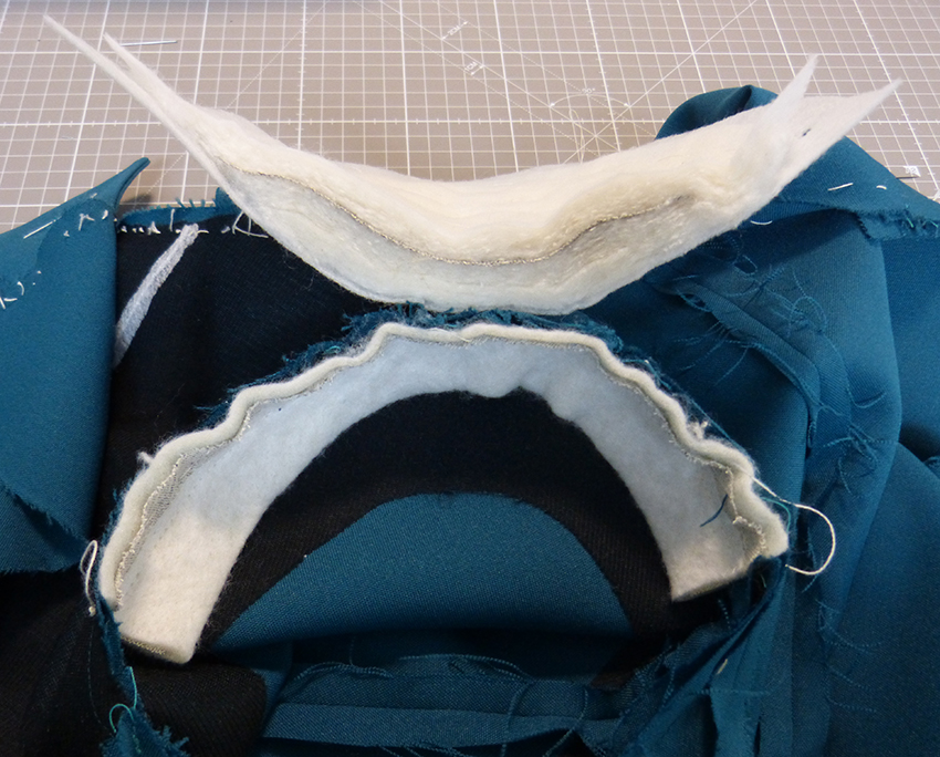 No se cose todo el cuello de una vez, primero se cose la capa de cuello entretelada a la parte del exterior de la chaqueta y después la parte del cuello sin entretela a la parte de forro.