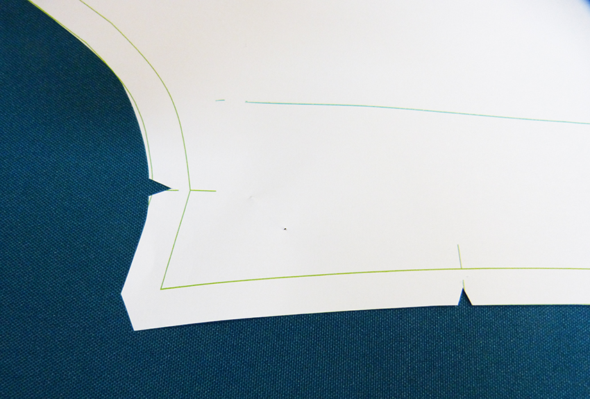 Para asegurar que todos los piquetes pasan a la tela, vamos a remarcarlas con tijera sobre el patrón haciendo dos cortes sobre cada una de ellas, en forma de piquito.