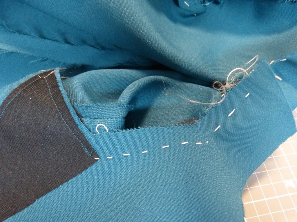 Sujetar bien con alfileres y si es necesario se hilvana. Una vez hilvanada la hombrera se cose por dentro, se cose a mano con un punto atrás largo a la costura de la sisa y calando todas las capas de tela, chorizo y hombrera, sin tensar demasiado el hilo.