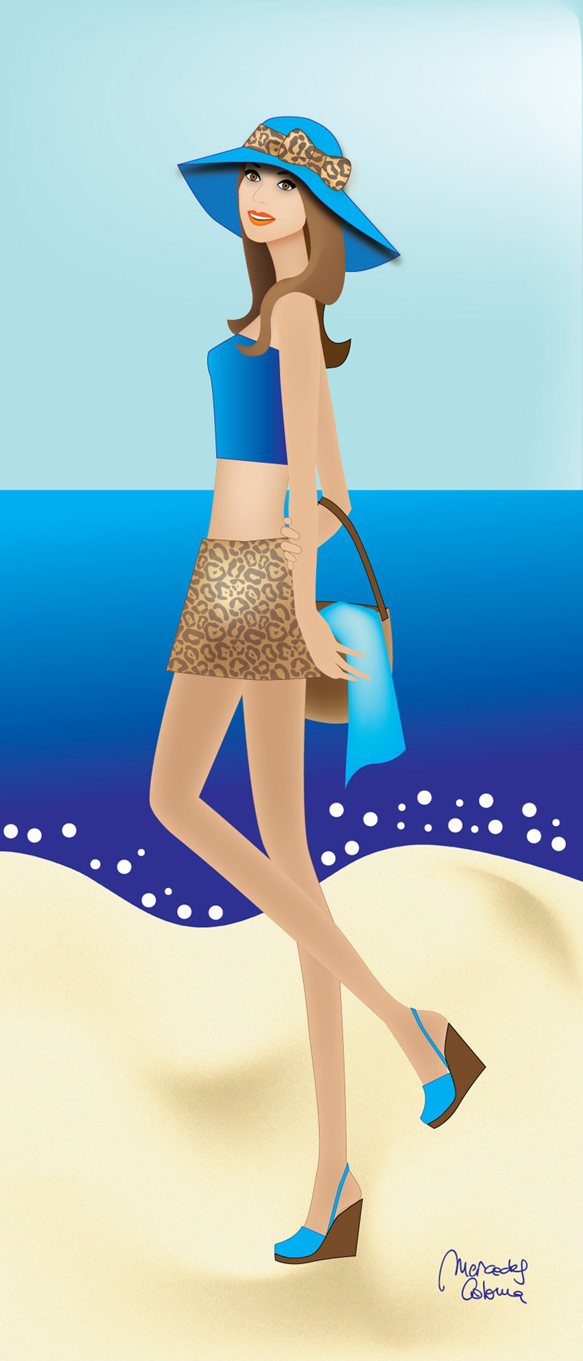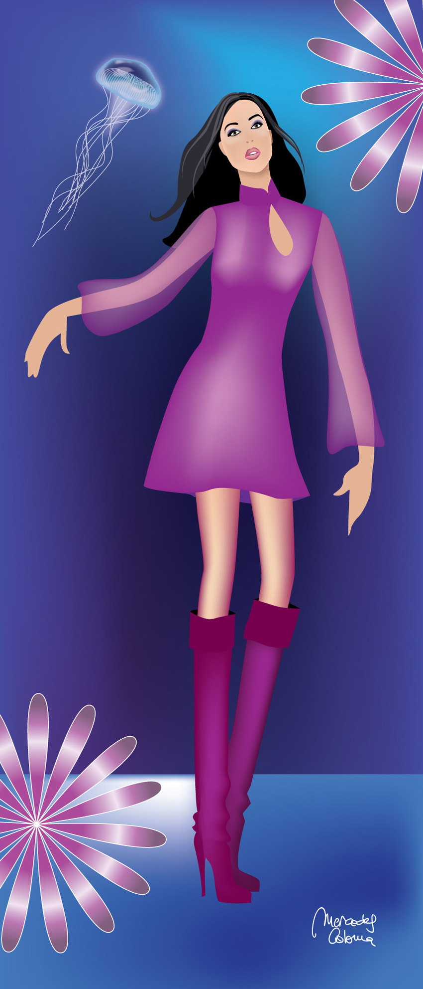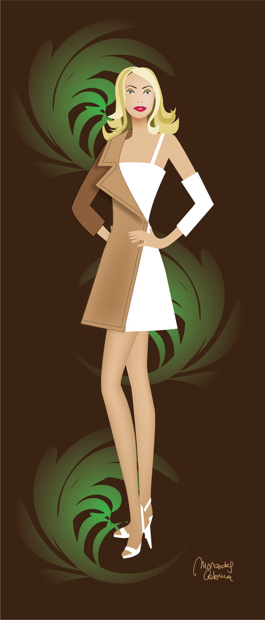 Siempre parto de un boceto a lápiz, habitualmente me inspiro en una fotografía para la pose de la modelo, dibujo la silueta, la escaneo y a continuación la visto y la coloreo con las diferentes herramientas de Adobe Illustrator.