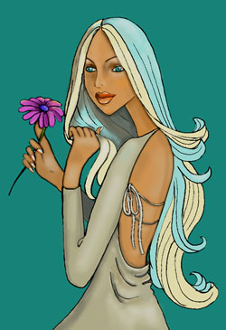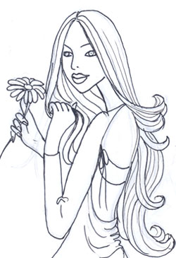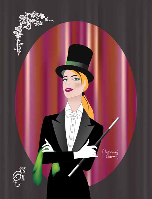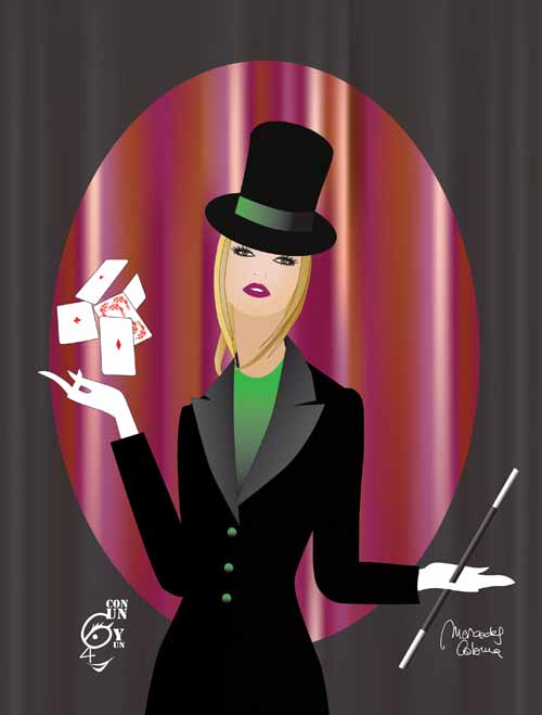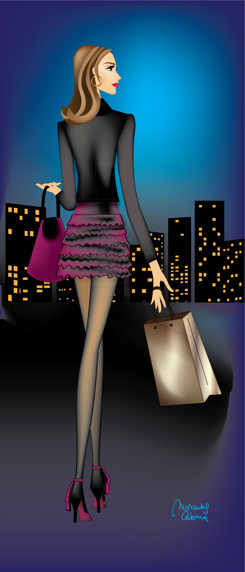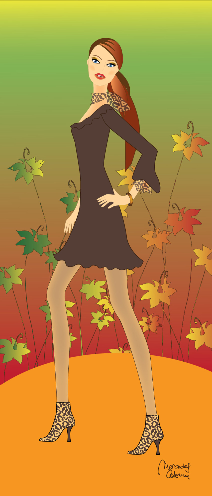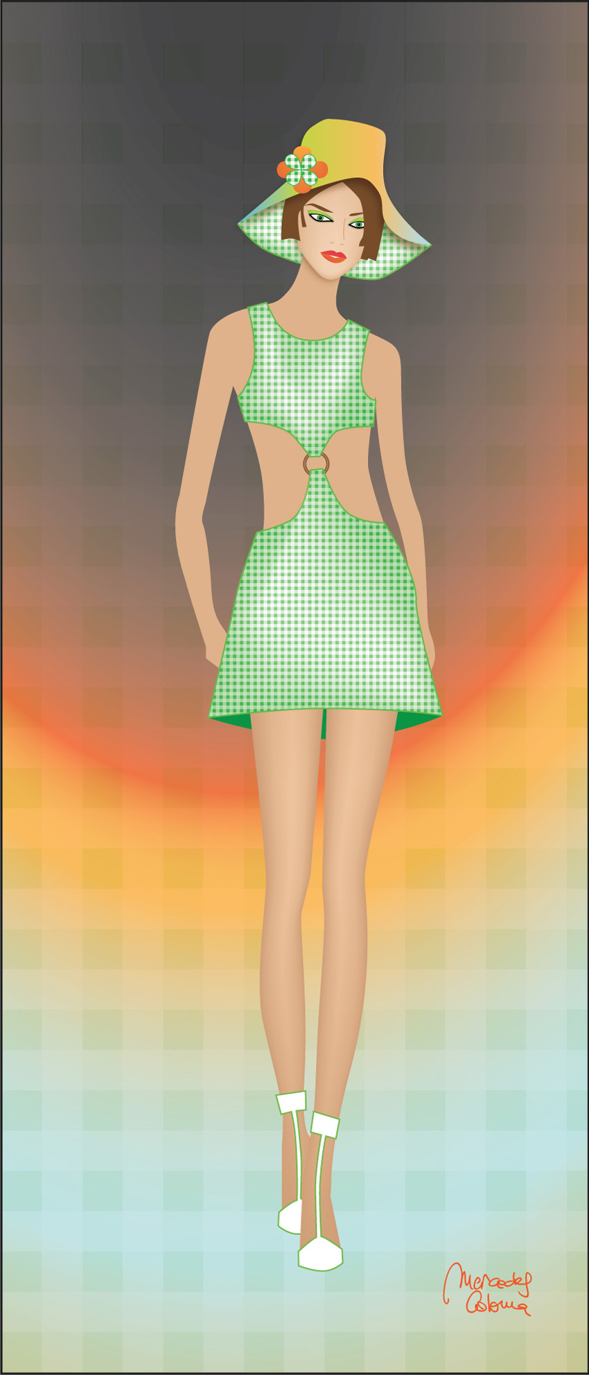 Siempre parto de un boceto a lápiz, habitualmente me inspiro en una fotografía para la pose de la modelo, dibujo la silueta, la escaneo y a continuación la visto y la coloreo con las diferentes herramientas de Adobe Illustrator.